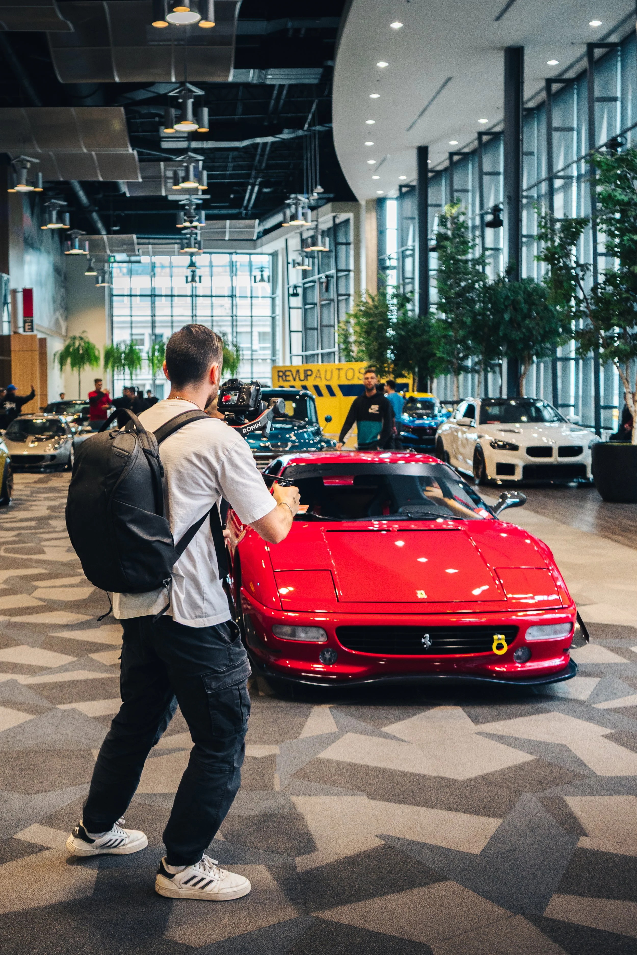 A man with a backpack taking photos of a red Ferrari sports car at an indoor car show, with other luxury cars and people in the background.