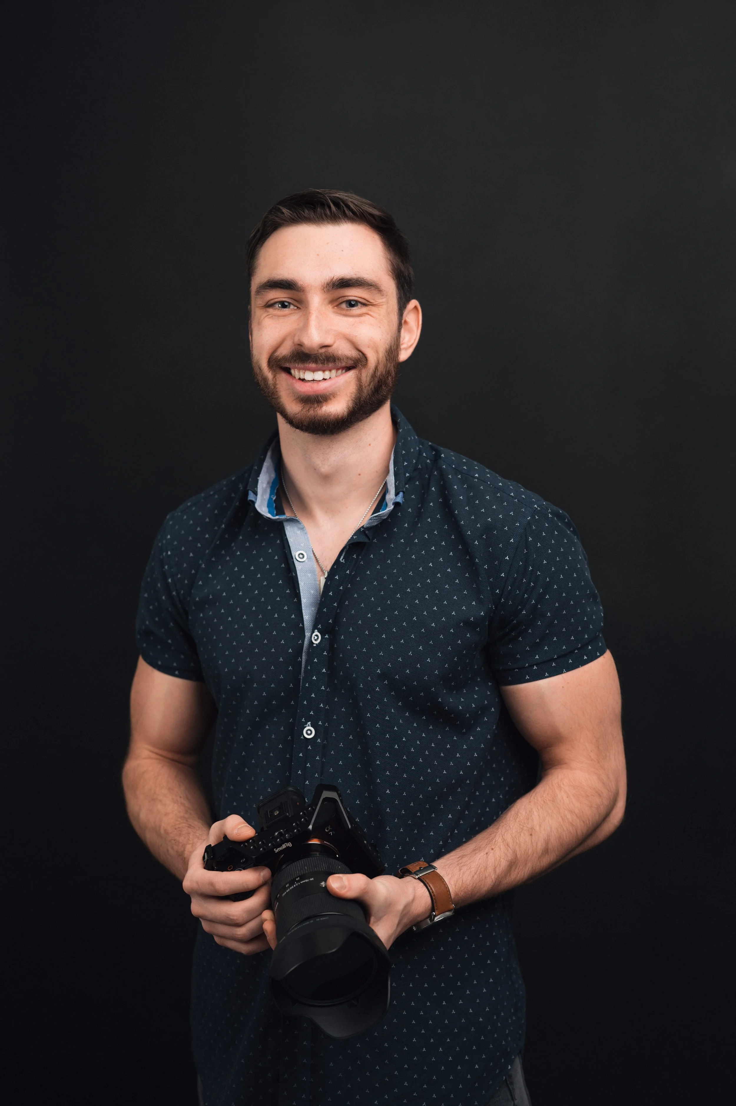 A smiling man with dark hair and beard wearing a navy blue shirt with small white patterns, holding a professional camera, standing against a dark background.