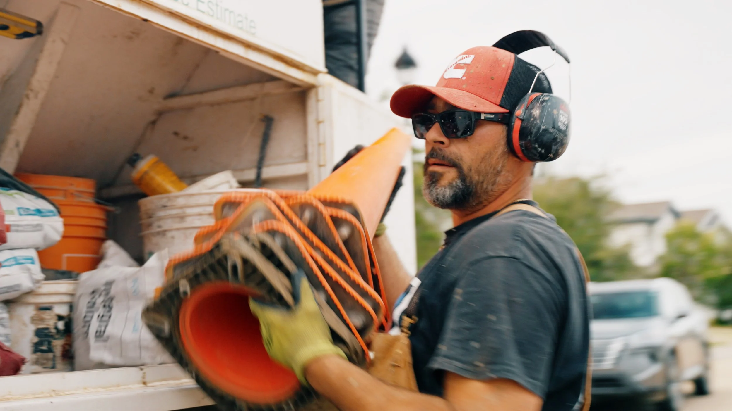 A man wearing sunglasses, a red cap, and ear protection is holding a large orange traffic cone in front of an open truck with supplies inside.