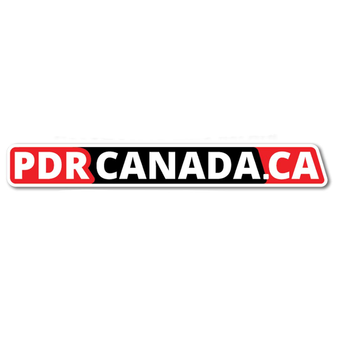A man with dark curly hair and a mustache is carefully fixing dents on a car, using a small hammer and holding a knockdown for precision.